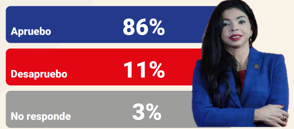 Ante la pregunta “¿Aprueba o desaprueba usted la gestión de Yeni Berenice Reynoso como procuradora general de la República?”, el 86% respondió que aprueba su desempeño, un 11% lo desaprueba y un 3% indicó que no sabe o prefirió no contestar.
