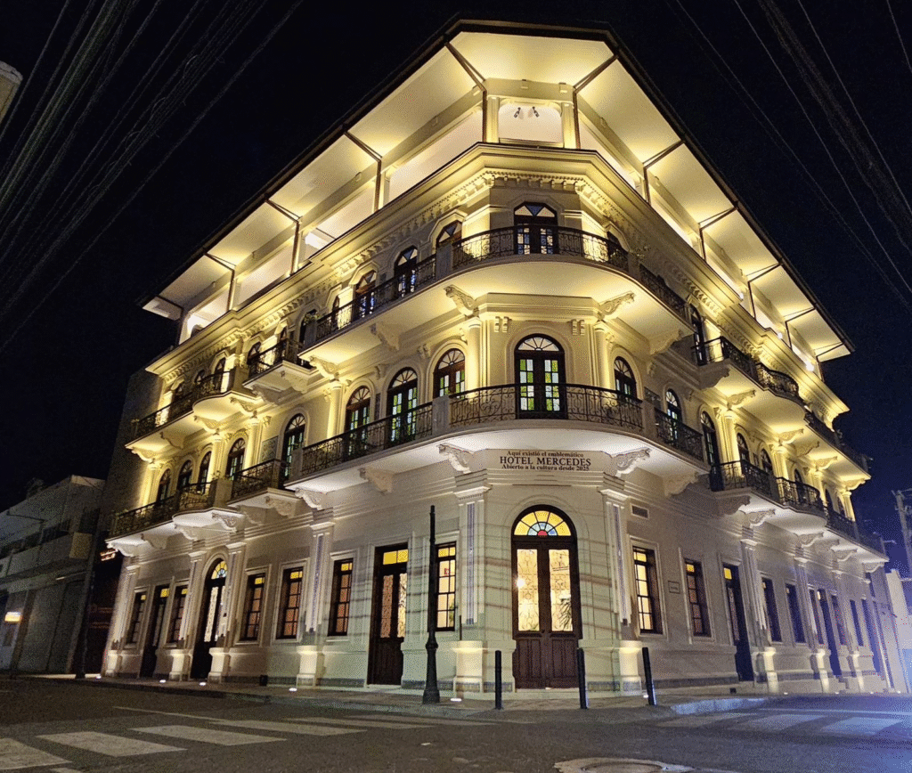 El Hotel Mercedes fue inaugurado el 9 de abril de 1929. Construido en concreto armado, contaba con 44 habitaciones distribuidas entre los pisos segundo y tercero, comedor en la primera planta y una terraza en el cuarto nivel, desde donde se disfrutaba una vista privilegiada de la ciudad.