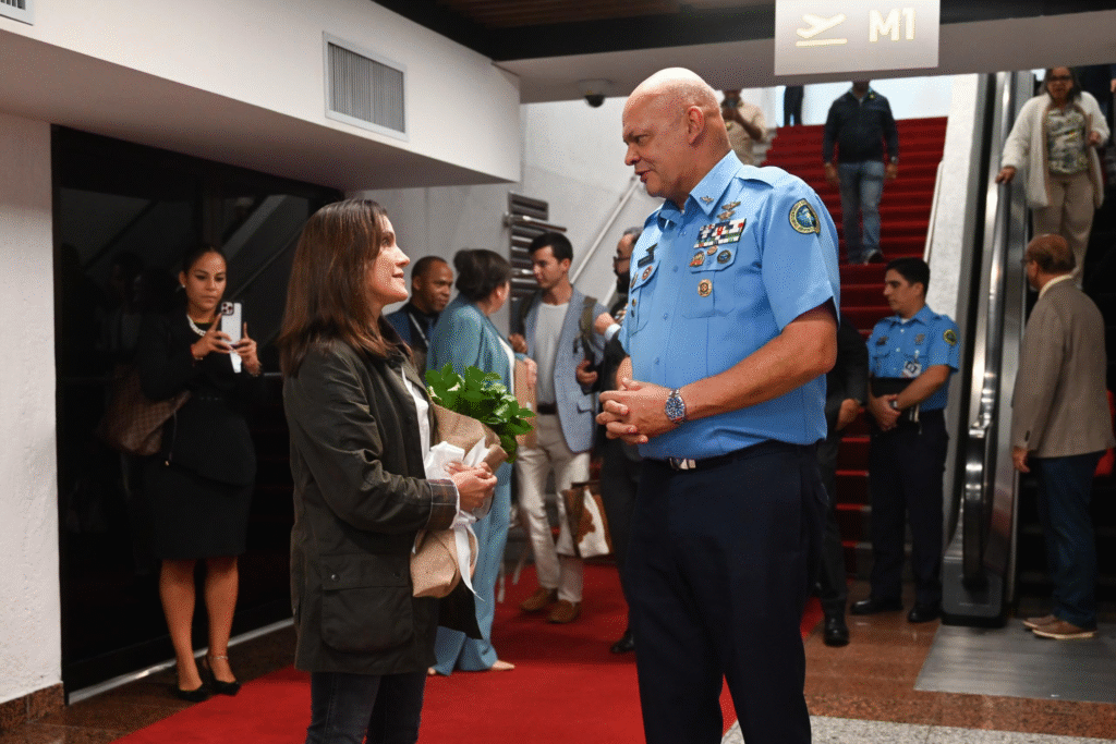 La llegada se produjo a las 3:00 de la tarde, en un vuelo procedente de Nueva York, por el Aeropuerto Internacional de Las Américas, Dr. José Francisco Peña Gómez (AILA). A su arribo, la distinguida funcionaria fue conducida al Salón de Embajadores, donde fue recibida por el general de brigada piloto Enmanuel Souffront Tamayo, FARD, director general del CESAC, y la Encargada de Negocios de la Embajada de los Estados Unidos en la República Dominicana, señora Patricia Aguilera.