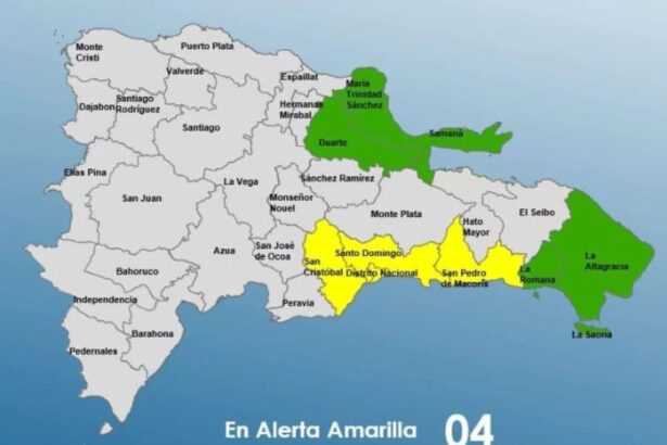 En tanto, bajo alerta verde se mantienen las provincias María Trinidad Sánchez, Samaná, Duarte, La Romana, La Altagracia, El Seibo, Hato Mayor y Monte Plata, donde también se prevén precipitaciones, aunque de menor intensidad.