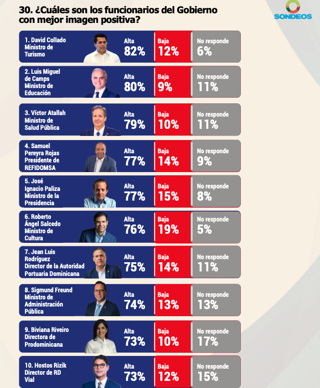 El ranking lo encabeza David Collado, ministro de Turismo, con un 82 % de imagen positiva, frente a un 12 % negativa y un 6 % que no respondió. Su gestión lo ha convertido en una de las figuras más visibles en la promoción internacional del país.