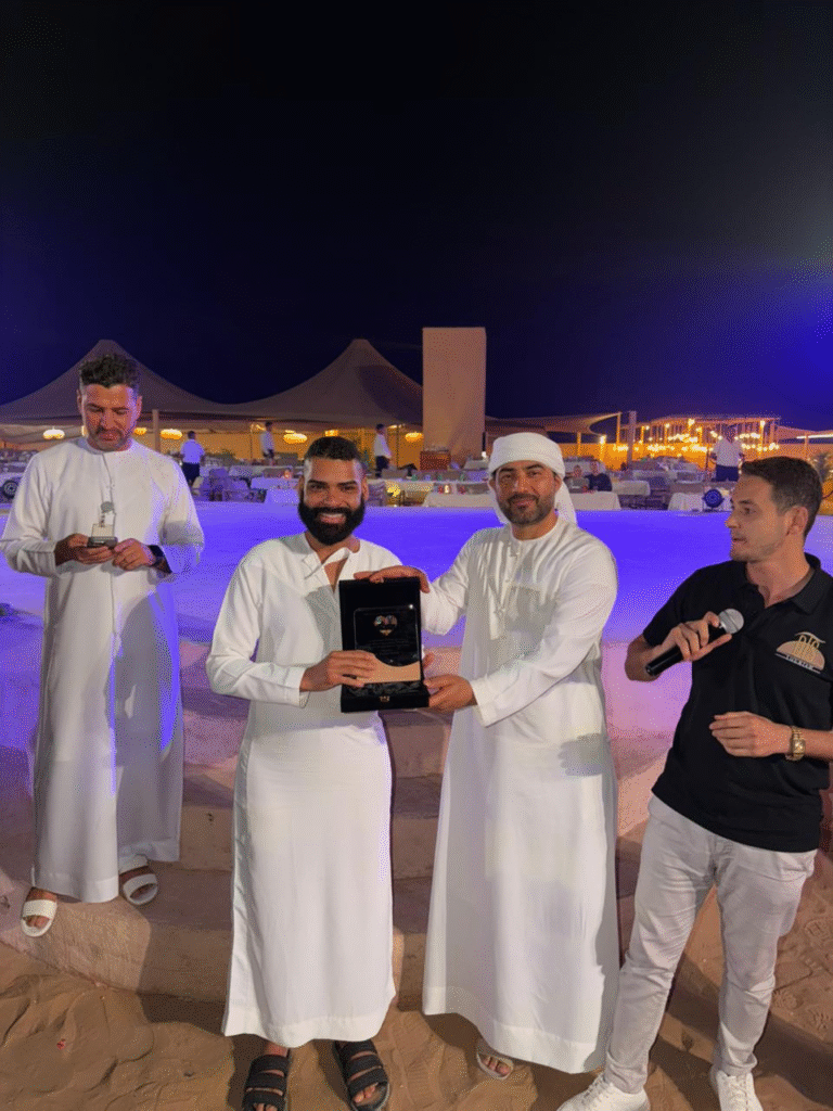 El galardón fue entregado durante una exclusiva noche en el desierto de Dubái, en un campamento beduino tradicional. La ceremonia se desarrolló en un ambiente auténtico y culturalmente enriquecedor, donde los invitados disfrutaron de una cena bajo las estrellas, rodeados de dunas iluminadas y un escenario que destacaba la riqueza del patrimonio árabe.