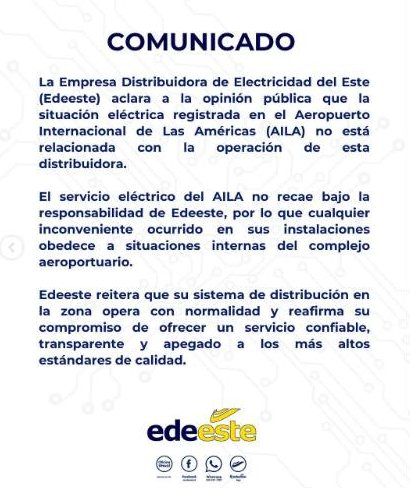 La Empresa Distribuidora de Electricidad del Este (Edeeste) aclaró que el apagón ocurrido en las instalaciones del Aeropuerto Internacional de Las Américas (AILA) no está relacionada con las operaciones de la distribuidora.