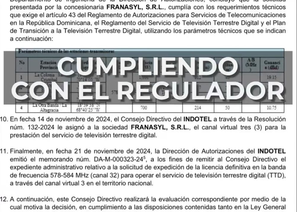 FRANASYL detalla que, tras recibir el canal virtual 3, INDOTEL aprobó su plan técnico de instalación para cuatro puntos geográficos y supervisó parte de las infraestructuras ya en funcionamiento, confirmando que cumplen con los parámetros establecidos. Además, recalca que la licencia está amparada en la Resolución 143-2024, la cual —según afirma— no ha sido objeto de ningún recurso administrativo ni judicial.