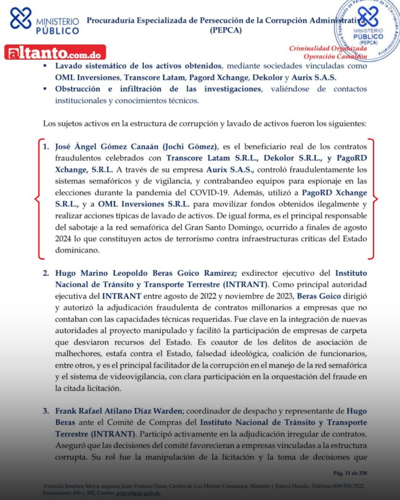 El documento señala que Gómez Canaán, a través de su empresa Aurix S.A.S., fue el beneficiario real de contratos fraudulentos suscritos con las compañías Transcore Latam S.R.L., Dekolor S.R.L. y PagoRD Xchange S.R.L.. Dichas operaciones le habrían permitido controlar de manera ilícita los sistemas semafóricos y de vigilancia del país.