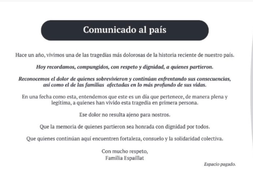 Santo Domingo.– A un año de uno de los hechos más trágicos en la historia reciente del país, la Familia Espaillat difundió un mensaje en el que exhorta a la ciudadanía a recordar a las víctimas desde el respeto y la dignidad.