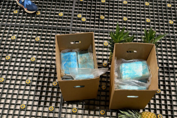 Durante un operativo realizado con apoyo de unidades caninas, los oficiales detectaron irregularidades en varias cajas de piña destinadas a exportación. Al inspeccionar la carga, encontraron 30 paquetes envueltos en fundas plásticas ocultos dentro de las cajas, con un peso aproximado de 33 kilogramos.