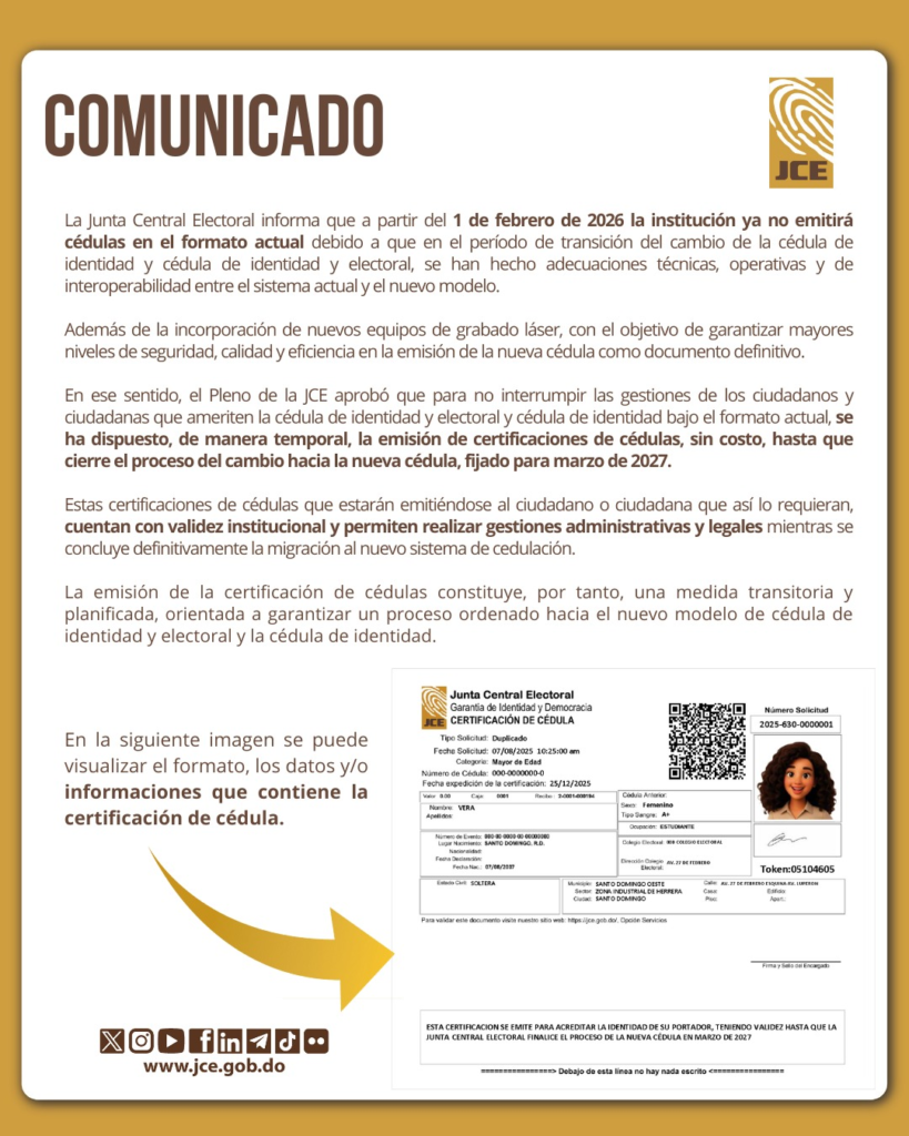 En ese sentido, el Pleno de la JCE para no interrumpir las gestiones de los ciudadanos y ciudadanas que ameriten la cédula de identidad y electoral y cédula de identidad bajo el formato actual dispuso, de manera temporal, la emisión de certificaciones de cédulas, sin costo, hasta que cierre el proceso del cambio hacia la nueva cédula fijado para marzo de 2027.