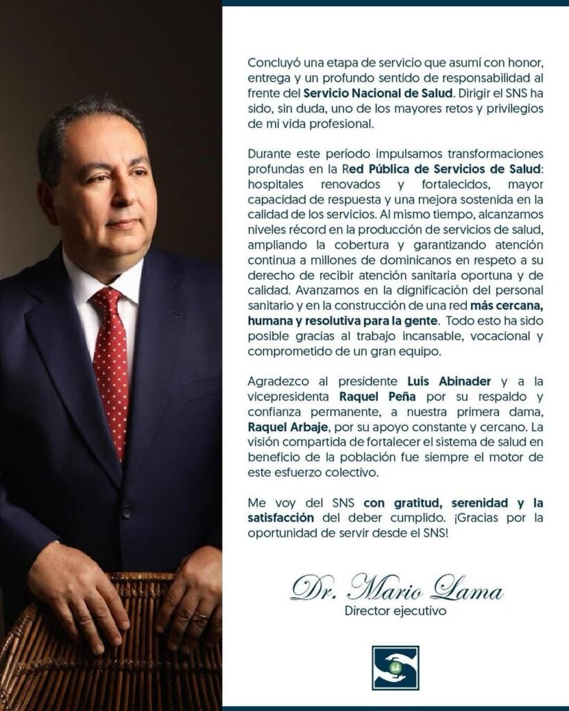 Santo Domingo.– El doctor Mario Lama se despidió este viernes del Sistema Nacional de Salud (SNS), tras presentar su renuncia como titular de la institución, poniendo fin a una gestión de cinco años al frente del principal órgano rector de la Red Pública de Salud del país.