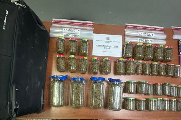 En un allanamiento en el sector Reparto Perelló, se detuvo a Edwin Miguel Belliard y se confiscaron 39 recipientes de marihuana (1,555 gramos), balanzas, una computadora, fundas y dinero.