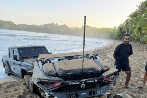 SAMANÁ.– Agentes de la Policía Turística (Politur) detuvieron este domingo a dos hombres que fueron sorprendidos conduciendo ilegalmente un jeep y un buggie sobre la arena de la playa La Bonita, en violación a las normas ambientales y turísticas que prohíben el tránsito de vehículos motorizados en zonas costeras.