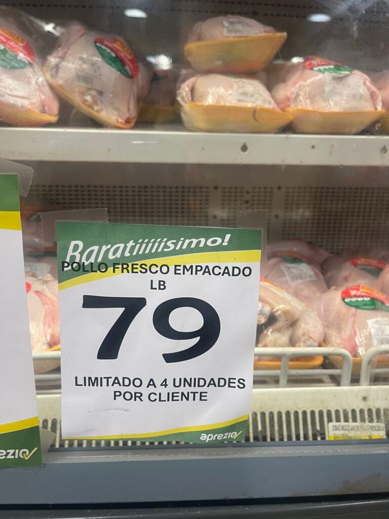Finalmente, en la avenida Winston Churchill, al visitar La Sirena y Supermercados Bravo, se confirmó nuevamente que el precio del pollo sigue fijado en RD$79 por libra.