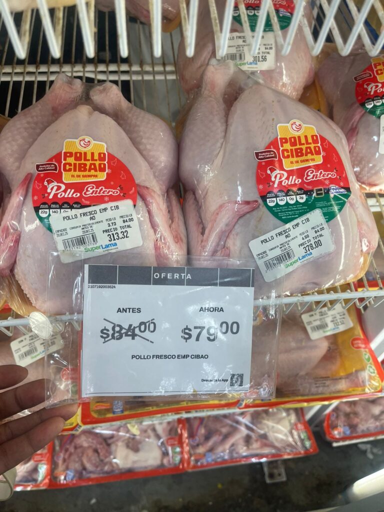 Santo Domingo.– Ante el incremento en la demanda de carne de pollo, uno de los productos más consumidos de la canasta básica, especialmente durante las festividades navideñas y a pocos días de Nochebuena, este medio realizó un recorrido por varios supermercados del Gran Santo Domingo para verificar el precio de la libra de este alimento.