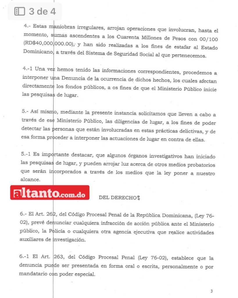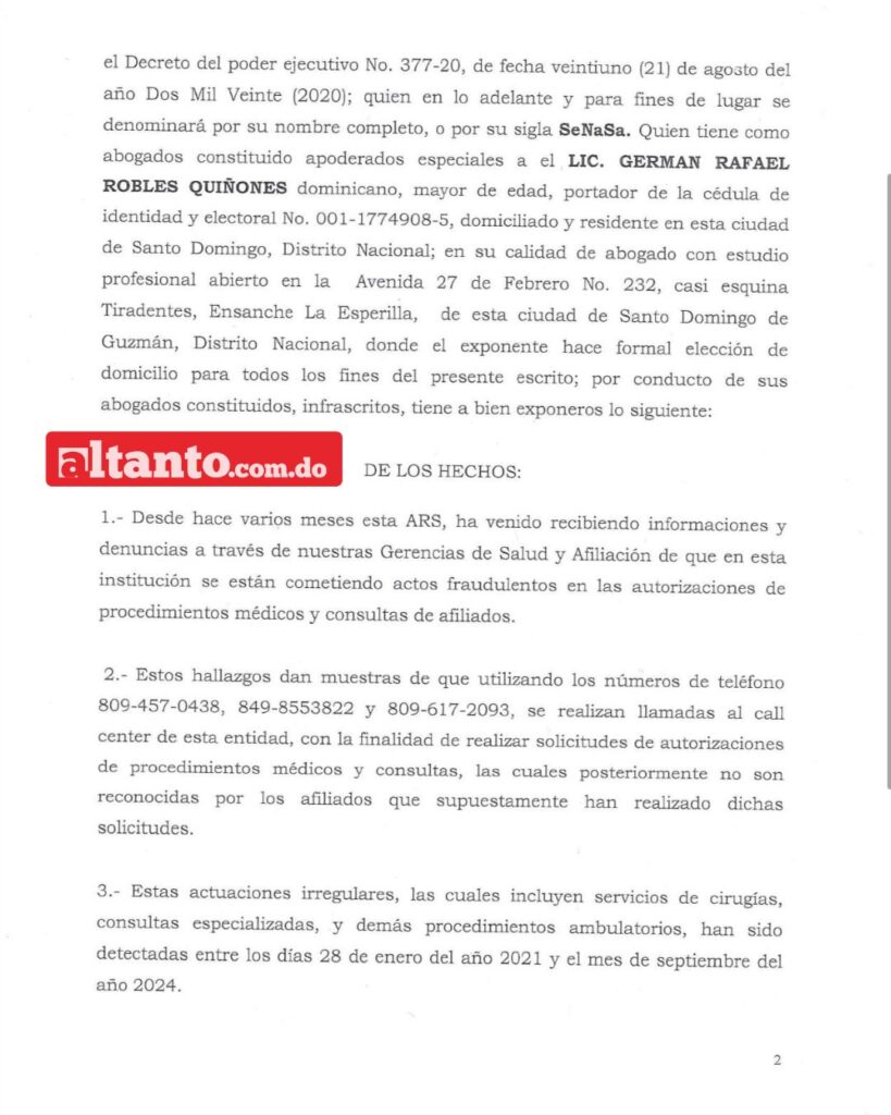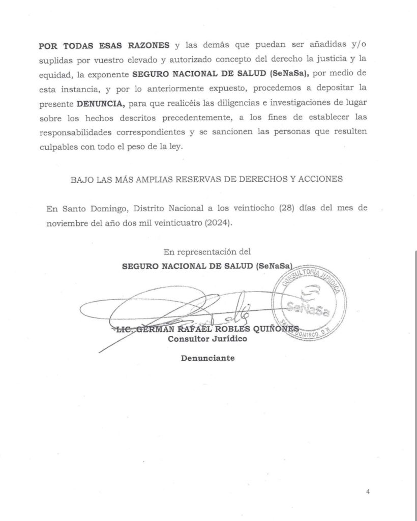 Santo Domingo.– El exdirector ejecutivo del Seguro Nacional de Salud (Senasa), Santiago Hazim, informó que en noviembre de 2024 presentó una denuncia formal ante el Ministerio Público, a través de la Consultoría Jurídica de la institución, por un presunto esquema de fraude millonario.
