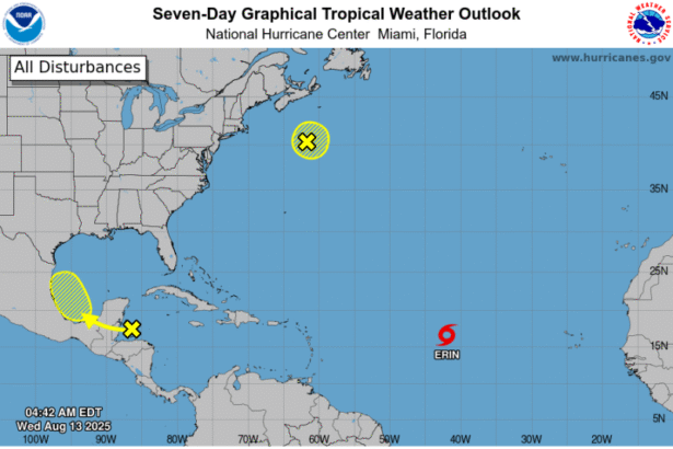 Santo Domingo.– El Instituto Dominicano de Meteorología (Indomet) informó que la tormenta tropical Erin tiene altas probabilidades de convertirse en huracán en las próximas 48 horas. El fenómeno se encuentra a unos 2,225 km al este de las Antillas Menores, moviéndose al oeste a 35 km/h, con vientos máximos sostenidos de 75 km/h y ráfagas superiores.