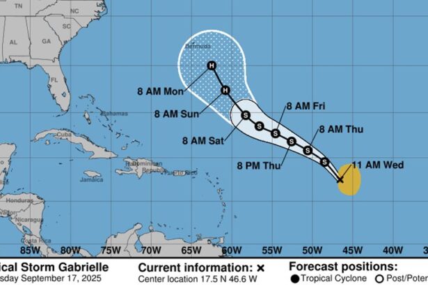 De acuerdo con el informe, Gabrielle avanza hacia el noroeste a unos 35 km/h, pero se espera que su movimiento se vuelva más errático y tienda hacia el oeste-noroeste durante los próximos días.