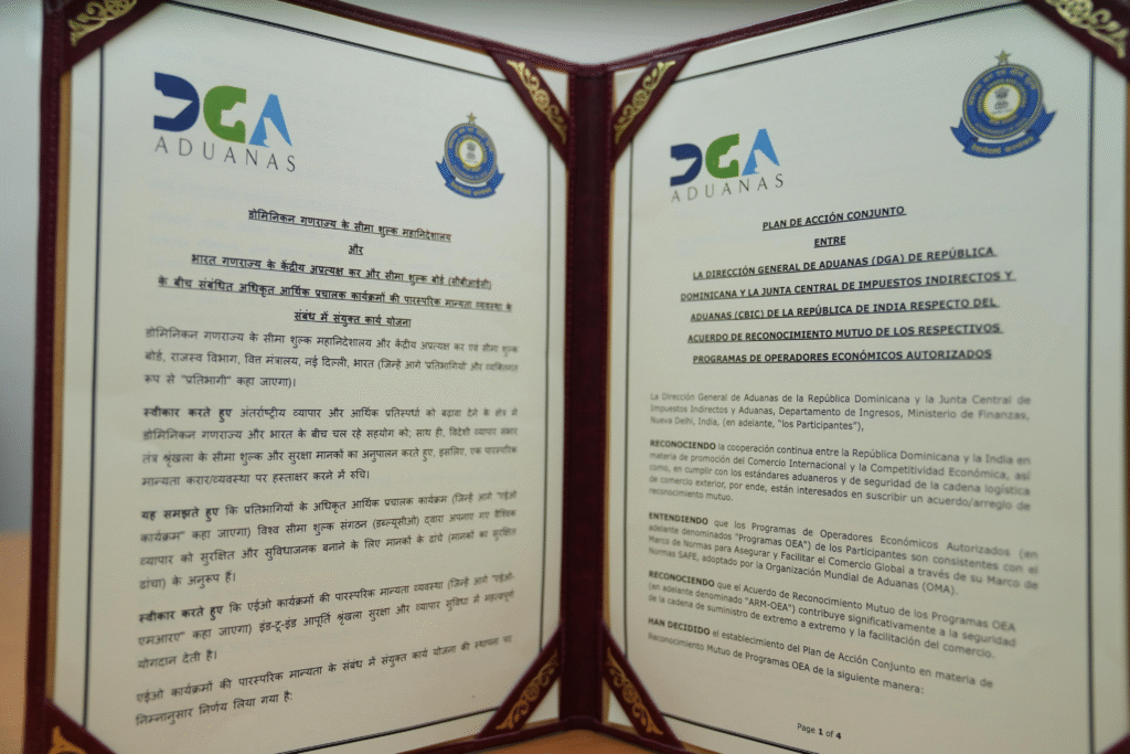 NuevaDelhi,India.-El director general de Aduanas, Yayo Sanz Lovatón y el director de la Junta Central de Impuestos Indirectos y Aduanas (CBIC) de la República de India, Surjit Bhujabal, firmaron un Acuerdo de Reconocimiento Mutuo para que los Operadores Económicos Autorizados (OEA), de ambos países obtengan las mismas ventajas comerciales y facilidades aduaneras en todos los puertos y aeropuertos de las dos naciones.